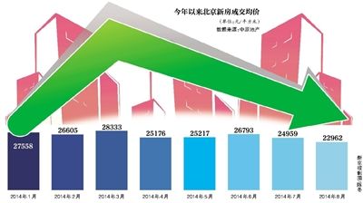 北京新房、二手房成交價格持續走低。中原地產統計數據顯示,8月北京新建住宅成交均價為22962元/平方米,環比下降8%,比去年同期價格下調了6.88%。這已是7月份新建商品房成交均價下降6.85%后連續兩個月下降。
