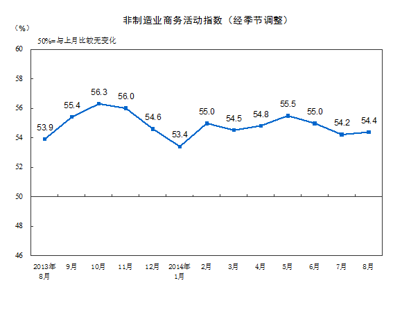 核心提示:2014年8月中國非制造業商務活動指數為54.4%