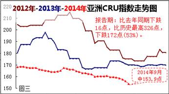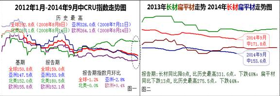 核心提示:2014年9月前半月全球鋼鐵走勢情況分析9月前半月的國際鋼市總體走勢趨弱。月中,159點的CRU總指數月環比下跌1.2%(跌幅擴大)。其中:亞洲指數153.9點,月環比下跌2.8%(跌幅擴大);歐洲指數152.4點,月環比上漲0.4%(漲幅擴大);北美指數180.5%,月環比持平;扁平材指數153.6點,月環比下跌1.3%(跌幅擴大);長材指數171.7點,月環比下跌1.1%(跌幅擴大)。CRU運行態勢顯示,全球鋼市在亞洲及其中國鋼材市場大幅下跌的影響下,再現漲跌互現格局的調整態勢。為此結合基本面情況預測,3季度末或四季度初,全球鋼市將繼續東弱西強的分化走勢,直至中國市場出現觸底反彈為止。(見下圖一、圖二)