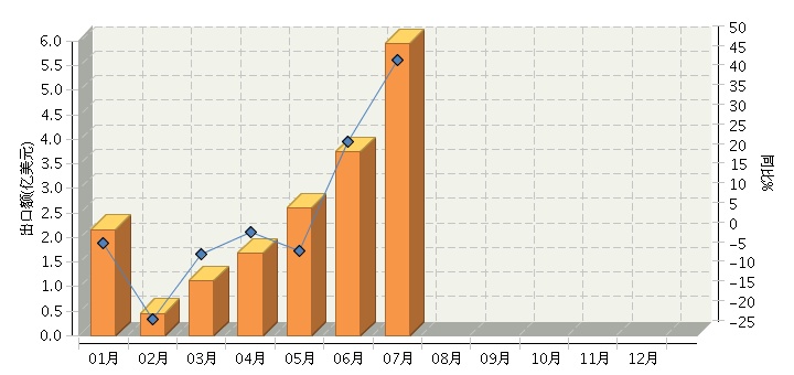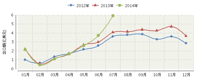 根據海關總署發布數據,2014年1~7月,全國毛皮及其制品行業累計完成出口額17.69億美元,同比增長15.00%。其中:7月份完成出口額5.94億美元,同比增長45.23%。2014年全國毛皮及其制品行業月度出口額及同比增長趨勢如下圖所示。