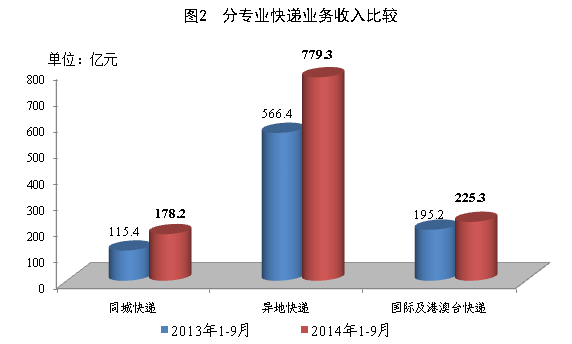 1-9月份,全國快遞服務企業業務量累計完成93.9億件,同比增長52%;業務收入累計完成1409.9億元,同比增長41.6%。其中,同城業務收入累計完成178.2億元,同比增長54.4%;異地業務收入累計完成779.3億元,同比增長37.6%;國際及港澳臺業務收入累計完成225.3億元,同比增長15.4%。