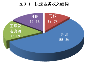 1-9月份,同城、異地、國際及港澳臺快遞業務收入分別占全部快遞收入的12.6%、55.3%和16%;業務量分別占全部快遞業務量的25.3%、72.3%和2.4%。與去年同期相比,同城快遞業務收入的比重上升1個百分點,異地快遞業務收入的比重下降1.6個百分點,國際及港澳臺業務收入的比重下降了3.6個百分點。