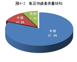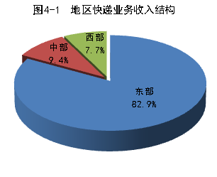 1-9月份,東、中、西部地區快遞業務收入的比重分別為82.9%、9.4%和7.7%,業務量比重分別為81.8%、10.8%和7.4%。與去年同期相比,東部地區快遞業務收入比重下降了0.2個百分點,快遞業務量比重上升了0.6個百分點;中部地區快遞業務收入比重上升了0.2個百分點,快遞業務量比重下降了0.1個百分點;西部地區快遞業務收入比重持平,快遞業務量比重下降了0.5個百分點。