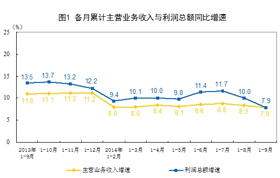 核心提示:前三季度全國規模以上工業企業利潤總額同比增7.9%1-9月份,全國規模以上工業企業實現利潤總額43652.2億元,同比增長7.9%,增速比1-8月份回落2.1個百分點;實現主營活動利潤40813.8億元,同比增長7.5%,增速比1-8月份回落2.1個百分點。