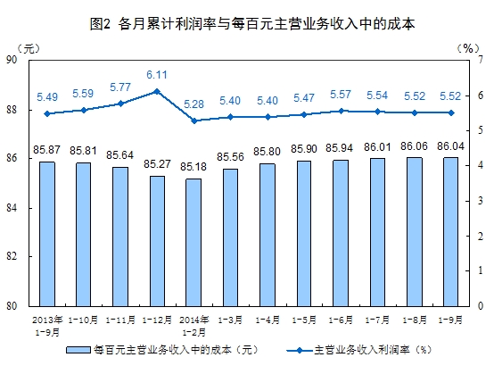 1-9月份,規模以上工業企業主營業務收入利潤率為5.52%,每百元主營業務收入中的成本為86.04元,每百元資產實現的主營業務收入為122.6元,產成品存貨周轉天數為13.7天。