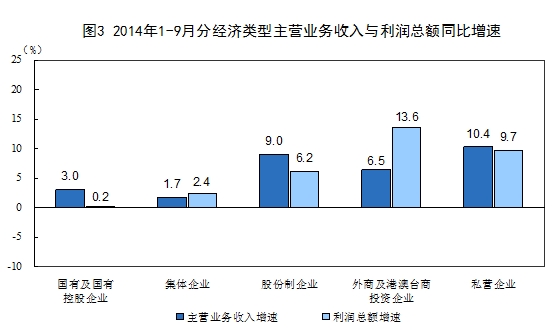 1-9月份,在規模以上工業企業中,國有及國有控股企業實現利潤總額11016.5億元,同比增長0.2%;集體企業實現利潤總額362.5億元,增長2.4%;股份制企業實現利潤總額28692.1億元,增長6.2%;外商及港澳臺商投資企業實現利潤總額10679.4億元,增長13.6%;私營企業實現利潤總額14300.4億元,增長9.7%.