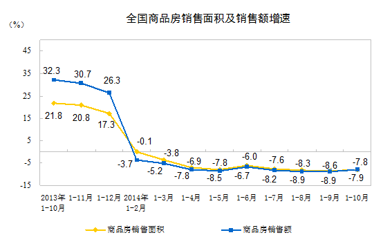10月份當(dāng)月,商品房銷(xiāo)售面積11362萬(wàn)平方米,同比下降1.6%,降幅比上月減緩8.7個(gè)百分點(diǎn);商品房銷(xiāo)售額7158億元,同比下降0.7%,降幅比上月減緩8.2個(gè)百分點(diǎn)。