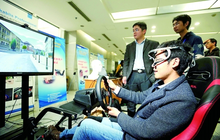 市民戴上眼鏡式眼動(dòng)儀進(jìn)行虛擬駕駛測(cè)試
