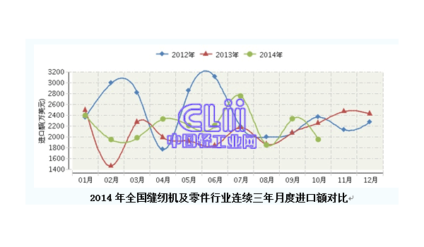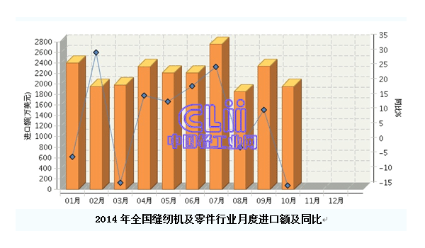 核心提示:2014年10月全國縫紉機及零件行業進口2.2億元2014年1~10月,全國縫紉機及零件行業累計完成進口額21,980.74萬美元,同比增長7.64%。其中:1月份完成進口額2396.72萬美元,同比增長-4.01%; 3月份完成進口額1984.98萬美元,同比增長-12.81%; 8月份完成進口額1851.63萬美元,同比增長-0.85%; 10月份完成進口額1952.57萬美元,同比增長-13.73%。10月下降幅度最大。