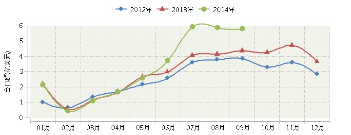2014年全國毛皮及其制品行業連續三年月度出口額對比