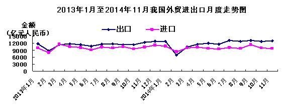 按美元計價,前11個月,我國進出口總值3.9萬億美元,增長3.4%。其中,出口2.12萬億美元,增長5.7%;進口1.78萬億美元,增長0.8%;貿易順差3325億美元,擴大42.2%。