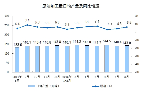 2015年8月中國原油加工量日均產量為143萬噸 同比增長6.5%