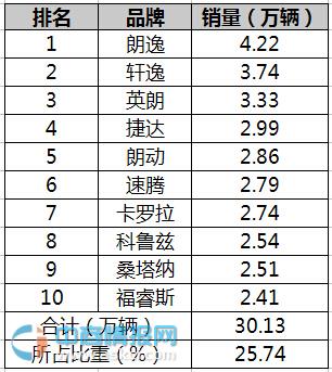 2015年11月轎車品牌銷量前十排名如下: