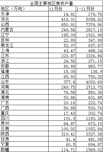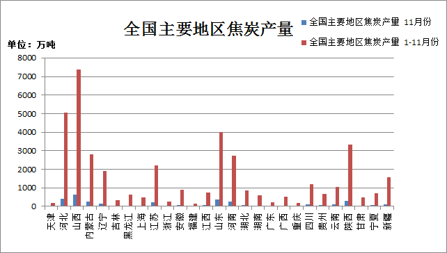 2015年1-11月全國各地焦炭產量統計分析
