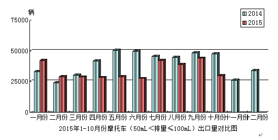 2015年10月份,摩托車產(chǎn)品(50mL<排量≤100mL)出口3.01萬輛,比去年同期下降了36.45;出口金額0.09億美元,與去年同期下降了39.11%。