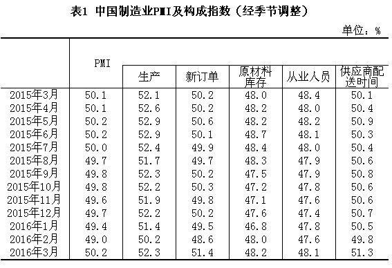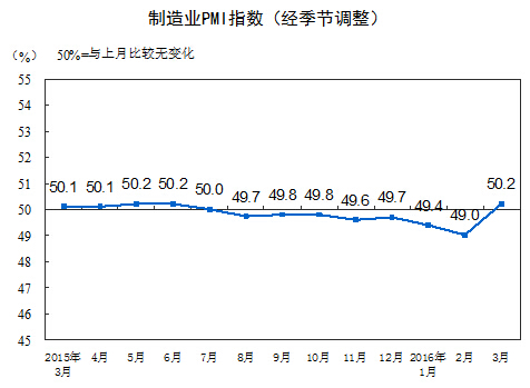 2016年3月份,中國制造業采購經理指數(PMI)為50.2%,比上月上升1.2個百分點,重回擴張區間。