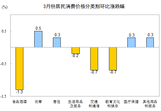 3月份,全國(guó)居民消費(fèi)價(jià)格總水平環(huán)比下降0.4%。其中,城市下降0.4%,農(nóng)村下降0.4%;食品價(jià)格下降1.8%,非食品價(jià)格下降0.1%;消費(fèi)品價(jià)格下降0.6%,服務(wù)價(jià)格下降0.2%。