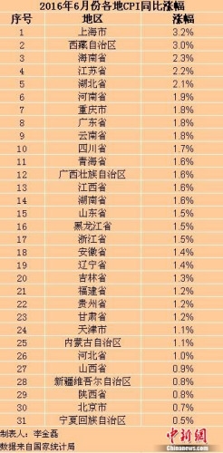 與全國漲幅相比,僅有上海、西藏、海南、江蘇、湖北5個地區(qū)6月份CPI漲幅超過全國水平。
