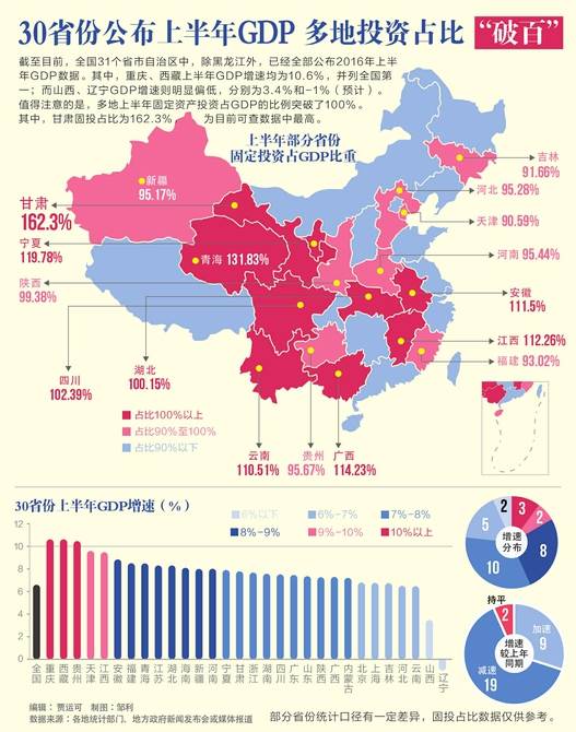 截至目前,全國31個省市自治區中,除黑龍江外,已經全部公布2016年上半年GDP數據。其中,重慶、西藏上半年GDP增速均為10.6%,并列全國第一;而山西、遼寧GDP增速則明顯偏低,分別為3.4%和-1%預計。值得注意的是,多地上半年固定資產投資占GDP的比例突破了100%。其中,甘肅固投占比為162.3%,為目前已知數據中最高。
