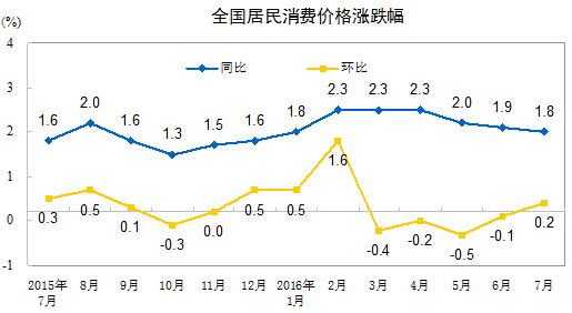 核心提示:2016年7月份,全國居民消費價格總水平同比上漲1.8%。其中,城市上漲1.8%,農村上漲1.5%;食品價格上漲3.3%,非食品價格上漲1.4%;消費品價格上漲1.4%,2016年7月份,全國居民消費價格總水平同比上漲1.8%。其中,城市上漲1.8%,農村上漲1.5%;食品價格上漲3.3%,非食品價格上漲1.4%;消費品價格上漲1.4%,服務價格上漲2.3%。7月份,全國居民消費價格總水平環比上漲0.2%。其中,城市上漲0.3%,農村持平;食品價格下降0.2%,非食品價格上漲0.3%;消費品價格下降0.1%,服務價格上漲0.6%。
