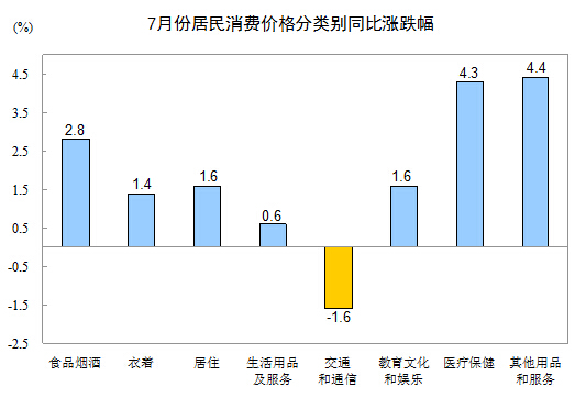 7月份,食品煙酒價格同比上漲2.8%,影響CPI上漲約0.83個百分點。其中,畜肉類價格上漲11.3%,影響CPI上漲約0.51個百分點(豬肉價格上漲16.1%,影響CPI上漲約0.42個百分點);水產品、鮮果、糧食價格分別上漲5.8%、0.5%和0.4%,合計影響CPI上漲約0.12個百分點;鮮菜、蛋價格分別下降4.3%和2.0%,合計影響CPI下降約0.11個百分點。7月份,其他七大類價格同比六漲一降。其中,其他用品和服務、醫療保健、居住、教育文化和娛樂、衣著、生活用品及服務價格分別上漲4.4%、4.3%、1.6%、1.6%、1.4%、0.6%;交通和通信價格下降1.6%。