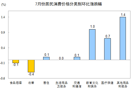 7月份,食品煙酒價格環比下降0.1%,影響CPI下降約0.03個百分點。其中,畜肉類價格下降1.3%,影響CPI下降約0.07個百分點(豬肉價格下降2.1%,影響CPI下降約0.06個百分點);鮮果價格下降1.9%,影響CPI下降約0.03個百分點;蛋價格下降1.5%,影響CPI下降約0.01個百分點;鮮菜價格上漲3.8%,影響CPI上漲約0.08個百分點;水產品價格上漲0.6%,影響CPI上漲約0.01個百分點。7月份,其他七大類價格環比五漲一降一平。其中,其他用品和服務、教育文化和娛樂、醫療保健、居住、交通和通信價格分別上漲1.4%、1.0%、0.7%、0.1%、0.1%;衣著價格下降0.4%;生活用品及服務價格持平。