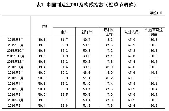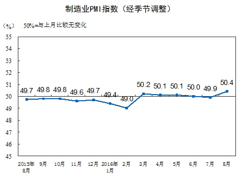 2016年8月份,中國制造業采購經理指數PMI為50.4%,比上月上升0.5個百分點,重回臨界點之上。