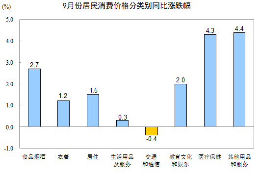 9月份,其他七大類價格同比六漲一降。其中,其他用品和服務、醫療保健、教育文化和娛樂、居住、衣著、生活用品及服務價格分別上漲4.4%、4.3%、2.0%、1.5%、1.2%、0.3%;交通和通信價格下降0.4%。