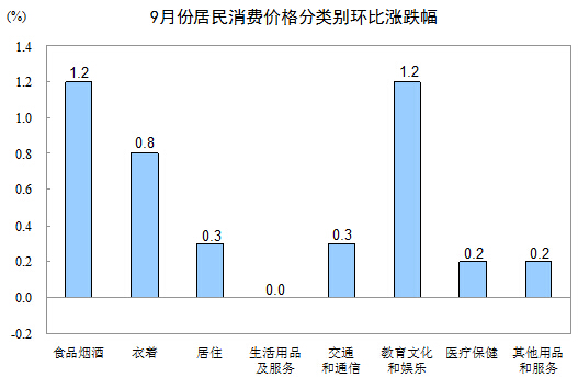 9月份,全國居民消費價格總水平環比上漲0.7%。其中,城市上漲0.7%,農村上漲0.7%;食品價格上漲1.7%,非食品價格上漲0.4%;消費品價格上漲0.8%,服務價格上漲0.5%。