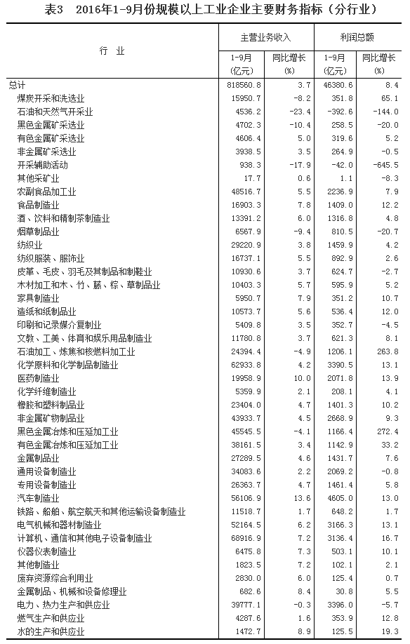 1-9月份,在41個工業(yè)大類行業(yè)中,31個行業(yè)利潤總額同比增加,10個減少。主要行業(yè)利潤情況如下:煤炭開采和洗選業(yè)利潤總額同比增長65.1%,農(nóng)副食品加工業(yè)增長7.9%,紡織業(yè)增長4.2%,石油加工、煉焦和核燃料加工業(yè)增長2.6倍,化學(xué)原料和化學(xué)制品制造業(yè)增長13.1%,非金屬礦物制品業(yè)增長9.3%,黑色金屬冶煉和壓延加工業(yè)增長2.7倍,有色金屬冶煉和壓延加工業(yè)增長33.2%,專用設(shè)備制造業(yè)增長5.8%,汽車制造業(yè)增長13%,電氣機(jī)械和器材制造業(yè)增長13.1%,計(jì)算機(jī)、通信和其他電子設(shè)備制造業(yè)增長16.7%,通用設(shè)備制造業(yè)下降0.8%,電力、熱力生產(chǎn)和供應(yīng)業(yè)下降5.7%,石油和天然氣開采業(yè)由同期盈利轉(zhuǎn)為虧損。