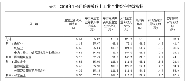 1-9月份,規(guī)模以上工業(yè)企業(yè)每百元主營業(yè)務(wù)收入中的成本為85.87元,每百元資產(chǎn)實(shí)現(xiàn)的主營業(yè)務(wù)收入為110.1元,人均主營業(yè)務(wù)收入為120.7萬元,產(chǎn)成品存貨周轉(zhuǎn)天數(shù)為14.2天,應(yīng)收賬款平均回收期為37.9天。