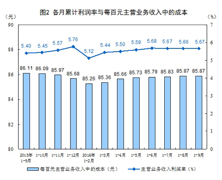 1-9月份,規(guī)模以上工業(yè)企業(yè)實(shí)現(xiàn)主營業(yè)務(wù)收入81.9萬億元,同比增長3.7%;發(fā)生主營業(yè)務(wù)成本70.3萬億元,增長3.5%;主營業(yè)務(wù)收入利潤率為5.67%。