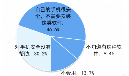 通過對未使用手機安全軟件的用戶進行調查發現,三成用戶認為手機安全軟件對自己沒有明顯幫助,超過兩成用戶則因為不知道/不會用這類軟件而沒有安裝。隨著手機安全軟件廠商的推廣和軟件自身操作便捷化的發展,未來手機安全軟件用戶規模仍有較大提升空間。此外,46.6%的用戶認為自己的手機很安全而沒有安裝這類軟件,其原因在于蘋果 iOS 系統用戶的占比高達整體手機用戶的 30.2%,且 iOS 系統天然的封閉環境導致其用戶不易受到惡意手機應用的侵害,因此使得蘋果手機用戶對于手機安全軟件的需求不強。
