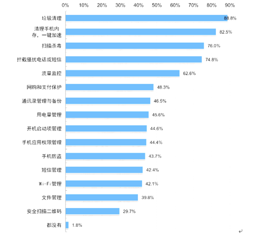 通過對手機安全軟件各功能的使用率進行調查發現,手機垃圾清理、手機內存清理、掃描殺毒、騷擾電話攔截和流量監控是目前手機網民最為常用的五項功能,使用率均在 60%以上。另外值得注意的是,1.8%的手機安全軟件用戶雖然在手機上安裝了手機安全軟件,但沒有使用過任何功能。