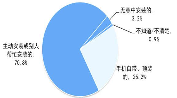 通過對用戶手機安全軟件的安裝方式進行調查可以發現,主動安裝手機安全軟件雖然已經成為主流,但手機出場系統預裝仍是重要渠道。數據顯示,主動安裝或請別人幫忙安裝手機安全軟件的用戶占比達到 70.8%;25.2%的用戶手機安全軟件是手機自帶或系統預裝的;4.1%的用戶在無意中安裝了手機安全軟件或者對這類軟件的安裝完全沒有意識。由于當前新網民逐漸向低學歷、低收入等信息弱勢群體滲透,而這類用戶相比主動安裝手機軟件更易受到手機預裝軟件的影響,預計未來手機安全軟件將更加依賴預裝渠道。