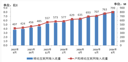 2015-2016年8月當月移動互聯(lián)網(wǎng)接入流量和戶均流量比較