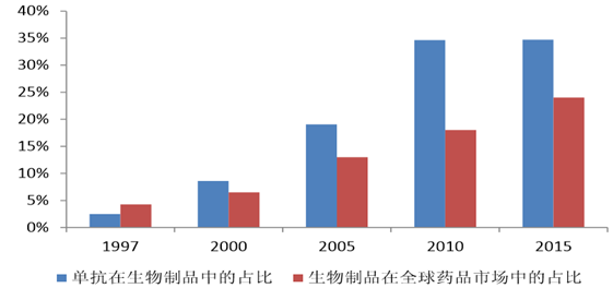 1997-2015 年單抗在全球生物制品行業(yè)中的市場(chǎng)占比