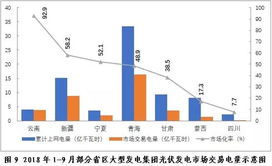 2018年1-9月,大型發電集團中交易電量最多的三個省份是青海、新疆和甘肅,分別為31.5億千瓦時、13.9億千瓦時和5.9億千瓦時,平均交易電價(含跨省跨區外送交易)分別為0.8008元/千瓦時、0.7106元/千瓦時和0.7447元/千瓦時。光伏發電市場化率居前幾位的省份依序為:云南(86.8%)、青海(63.1%)、新疆(52.9%)、寧夏(47.2%)。