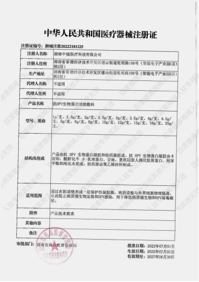 衛茵清抗HPV生物蛋白功能敷料,它就是通過國家藥品監督管理局的嚴格審批,獲得了上市許可的國家二類醫療器械。它的注冊證編號為:湘械注準20222181225。