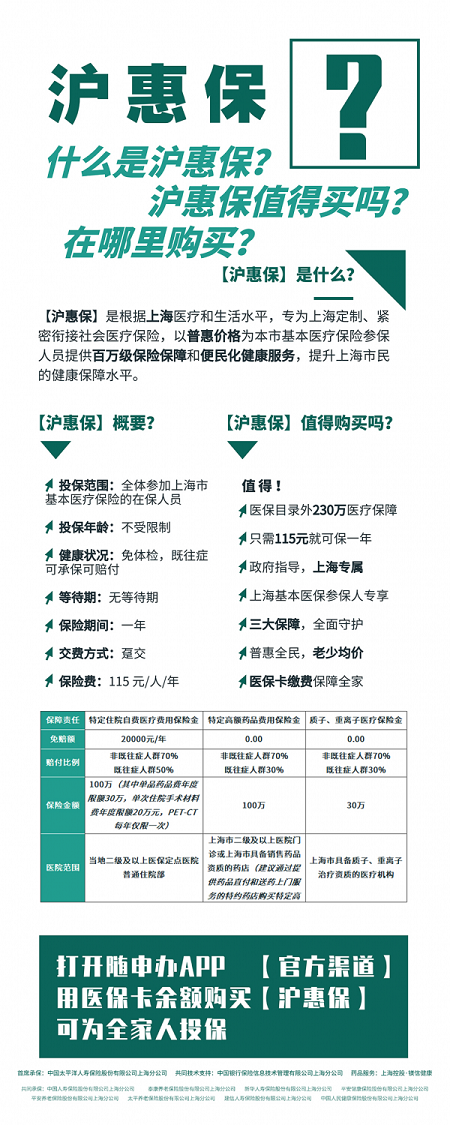 “滬惠保”是上海政府指導,面向1900余萬上海基本醫保參保人推出的城市定制型商業補充醫療保險。