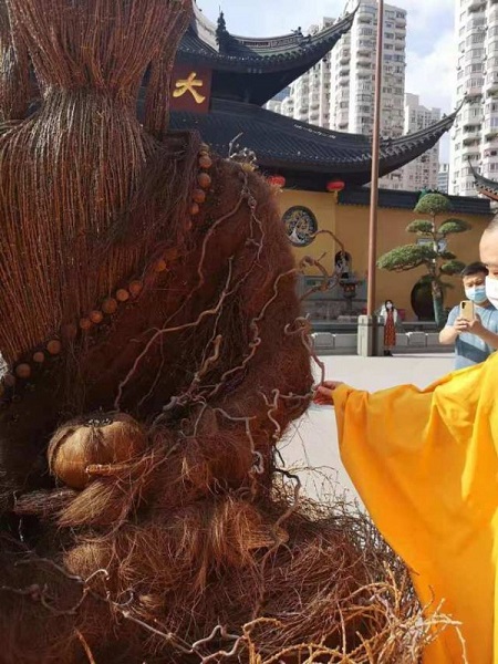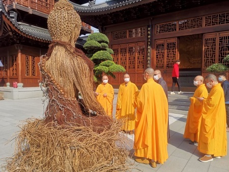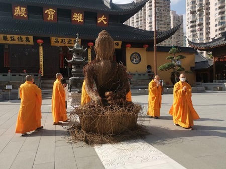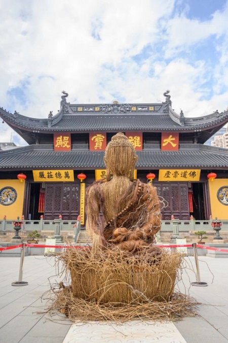 在策展人Claire Pan的撮合下,國內外大地藝術家打開了國界,耗時1個月,在上海玉佛禪寺大雄寶殿之前共同打造了一尊由自然材質塑成的佛像。這尊佛像由玉佛禪寺方丈親自開光祈福,同時也受到了入寺信眾的歡迎,紛紛進行了瞻仰膜拜。