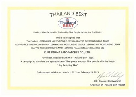 而“THAILAND BEST”(泰最優),作為泰國政府向國內外推薦泰國名優產品的統一認證標識,其認證過程非常嚴苛。經專業評審委員會嚴格的篩選和鑒定后,Leafpro因具備有特色、優質、口碑好等特點,才獲得該認證。