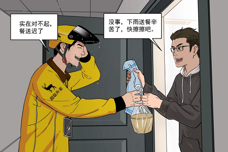 有一次趕上雨夜,曹維將餐送到顧客手中時,收到了顧客遞上的毛巾。“當時我以為會被投訴的,沒想到顧客叫我進門,還給了我干毛巾,讓我把頭發擦干再走。真的挺感動,那天天氣很冷,但內心很溫暖”曹維至今回憶起來臉上泛出笑容。