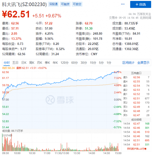 科大訊飛股價飆升至62.56元,市值逼近1400億元