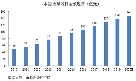 目前,中國已成為全球按摩器具市場需求增長最快的地區之一,中國按摩器具市場規模快速增長。2010-2019年,中國按摩器具市場規模由49億元增長至139 億元。至2020年,中國按摩器具市場規模預計將接近150億元。2010-2020年,中國按摩器具市場規模的具體情況如下: