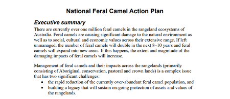 當地人覺得這群龐大數量的駱駝給他們的生活造成了很大困擾:駱駝飲水量巨大,一次能喝下好幾加侖的水,對基礎設施造成破壞,把樹都毀掉,把草都吃光,又沒有什么經濟價值。所以,從2010年開始,澳洲政府簽署了一項名為National Feral Camel Action Plan《澳大利亞野生駱駝管理項目計劃》,每年都要控制這些野生駱駝的增長數量。
