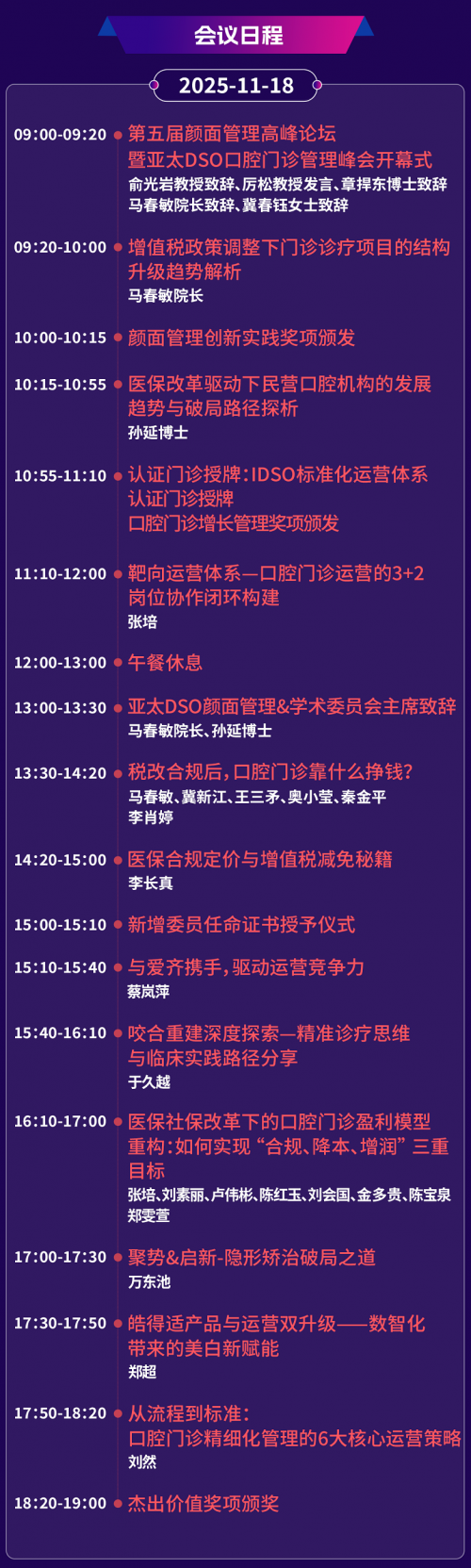 核心提示:大會(huì)精準(zhǔn)聚焦當(dāng)前口腔行業(yè)合規(guī)運(yùn)營(yíng)的三大規(guī)范 —— 稅務(wù)、醫(yī)保、社保!將通過專業(yè)的政策解讀,結(jié)合豐富的實(shí)戰(zhàn)案例分析,幫助參會(huì)者深入理解政策要求,找到有效方法,讓大家能夠提前布局,搶占行業(yè)發(fā)展先機(jī),為門診的合規(guī)運(yùn)營(yíng)保駕護(hù)航。這是一場(chǎng)聚焦行業(yè)生存痛點(diǎn)的實(shí)戰(zhàn)峰會(huì),也正契合當(dāng)下口腔從業(yè)者們的迫切需求。以 “合規(guī)・破局・突圍” 為主題的第五屆顏面管理高峰論壇暨亞太 DSO 口腔門診管理峰會(huì),將于 2025 年 11 月 18 日至 19 日在北京・京東集團(tuán)總部盛大召開。我們誠邀口腔業(yè)內(nèi)專家領(lǐng)袖、口腔醫(yī)療機(jī)構(gòu)管理者與經(jīng)營(yíng)者、口腔醫(yī)生、上下游供應(yīng)商等同仁撥冗蒞臨,與我們共同解鎖 “稅務(wù)、醫(yī)保、社保合規(guī)三模塊” 落地方案,開辟可持續(xù)發(fā)展新路徑。