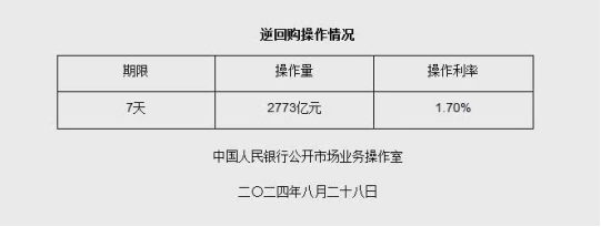 核心提示:8月28日,央行以固定利率、數(shù)量招標方式開展了2773億元7天期逆回購操作,操作利率1.70%,與此前持平。8月28日,央行以固定利率、數(shù)量招標方式開展了2773億元7天期逆回購操作,操作利率1.70%,與此前持平。