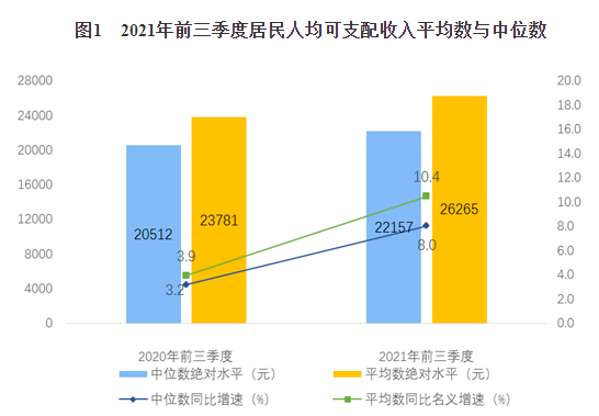 前三季度,全國居民人均可支配收入中位數22157元,增長8.0%,中位數是平均數的84.4%。其中,城鎮居民人均可支配收入中位數32417元,增長8.0%,中位數是平均數的90.2%;農村居民人均可支配收入中位數11962元,增長12.3%,中位數是平均數的87.1%。