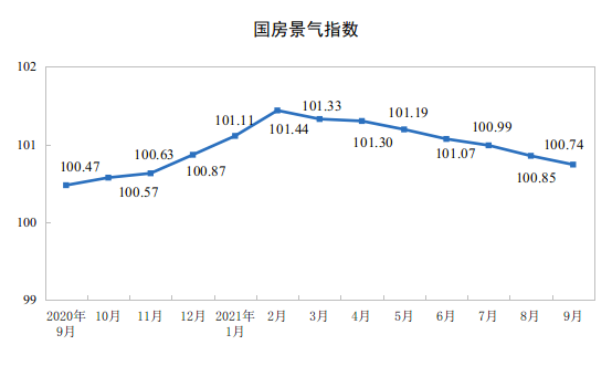 9月份,房地產(chǎn)開發(fā)景氣指數(shù)(簡稱“國房景氣指數(shù)”)為100.74。